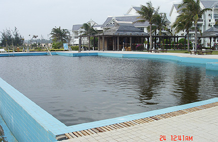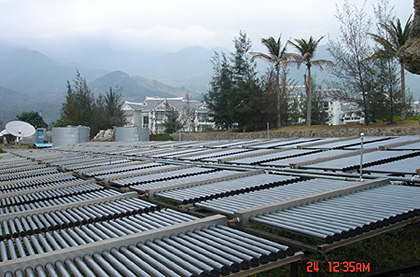 該工程分為前后兩期工程,一期工程是在距海邊50米處,開挖2000平方米的沙坑,在沙灘上做基礎(chǔ),安裝600平方米太陽能集熱管,日產(chǎn)熱水60噸。二期安裝700平方米太能集熱管。