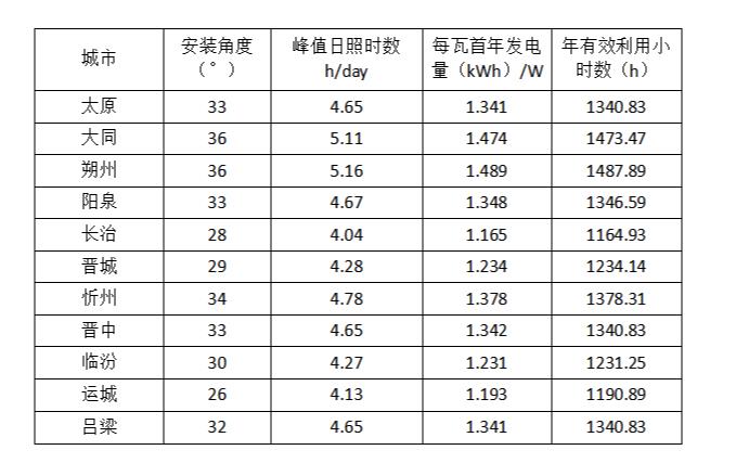 山西省光伏電站的最佳安裝傾角、發(fā)電量、年利用小時數(shù)的參考值是多少?