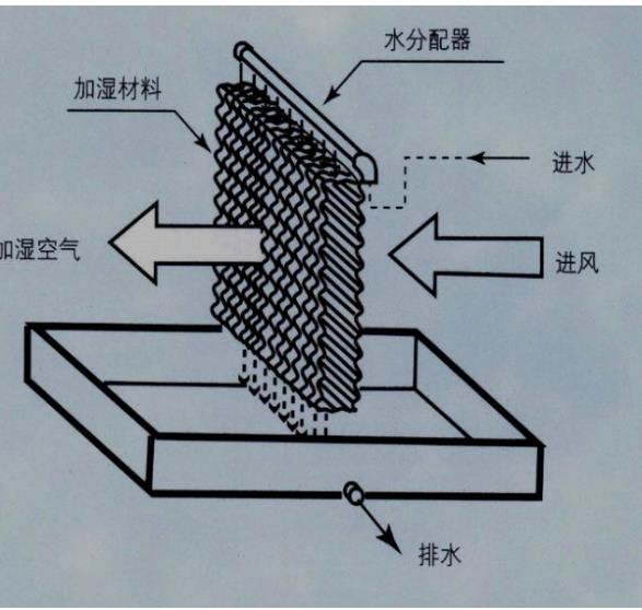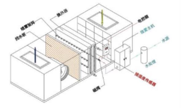 空調機組采用濕膜加濕器來對空氣進行加濕,濕膜加濕器是一種蒸發汽化型加濕器, 常見的濕膜其介質為由高分子無機材料經過一系列的燒結過程而形成的紙狀物.并具有很強的吸水性, 當干空氣通過介質時, 水分漸漸蒸發(吸收空氣中的熱量), 從而使空氣中的濕度增加. 濕膜加濕器可使用普通生活用水或自來水。其工作原理為:打開供水系統,水在重力作用下從高布水性濕膜材料頂部向下浸潤滲透。當送風氣流穿過濕膜時,水與空氣進行熱交換,水氣化蒸發,使氣流變成高濕空氣,從而達到加濕的目的。