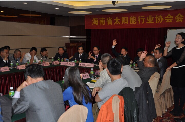 成立大會上,與會代表表決通過了協會管理辦法和領導機構成員,表決結果顯示,海南光譜太陽能技術工程有限公司當選首任會長單位,海南藍冠環保節能科技有限公司、海南巴頓工程安裝有限公司、海南逸凡新能源科技開發有限公司、海南奧普佳新能源科技有限公司、三亞鑫京商貿有限責任公司為副會長單位,海南日源太陽能開發有限公司為秘書長單位。