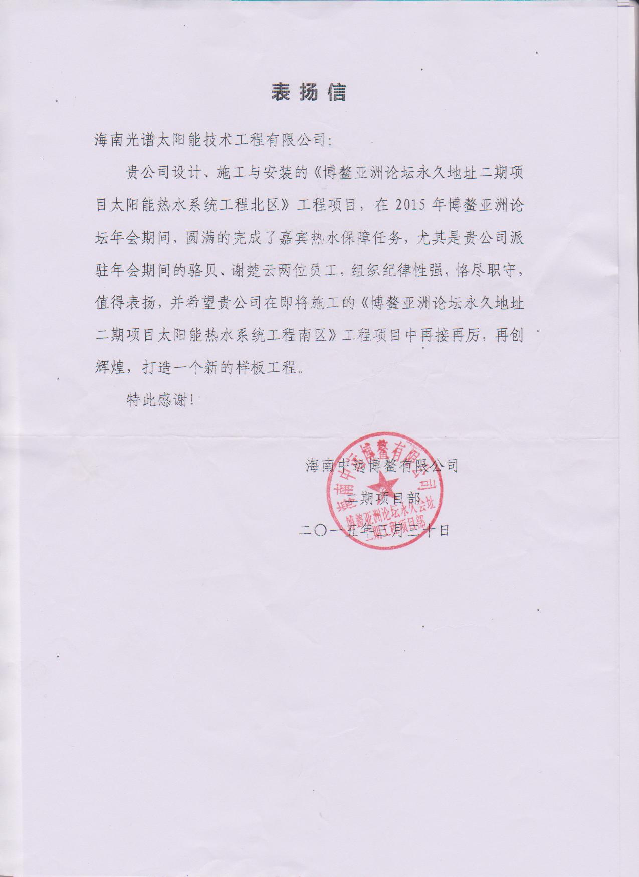 我公司設(shè)計(jì)、施工與安裝的《博鰲亞洲論壇永久會(huì)址二期工程太陽(yáng)能熱水系統(tǒng)工程施工合同》項(xiàng)目,于2015年02月10日順利竣工,并通過(guò)甲方合格驗(yàn)收,投入使用于2015年博鰲亞洲論壇年會(huì),圓滿(mǎn)完成了博鰲亞洲論壇年會(huì)嘉賓熱水保障任務(wù),受到博鰲亞洲論壇永久會(huì)址二期工程項(xiàng)目部的表?yè)P(yáng)。借此,我公司承諾:在今后設(shè)計(jì)、施工與安裝太陽(yáng)能熱水系統(tǒng)工程中,將更加努力,做到按照國(guó)家質(zhì)量技術(shù)標(biāo)準(zhǔn)要求,精準(zhǔn)設(shè)計(jì)、精心規(guī)范施工,為打造更多、更好的優(yōu)質(zhì)樣板工程而奮斗!