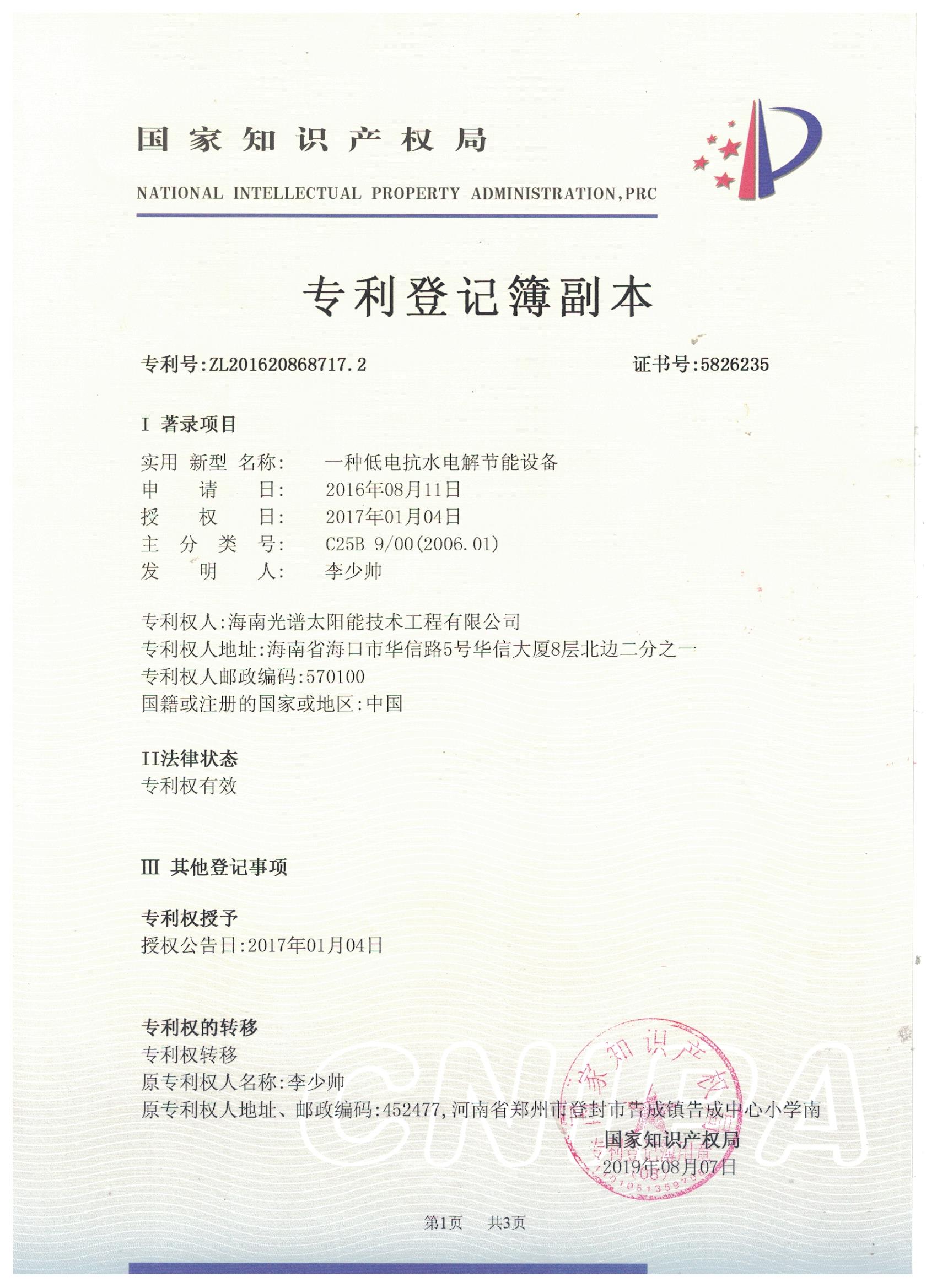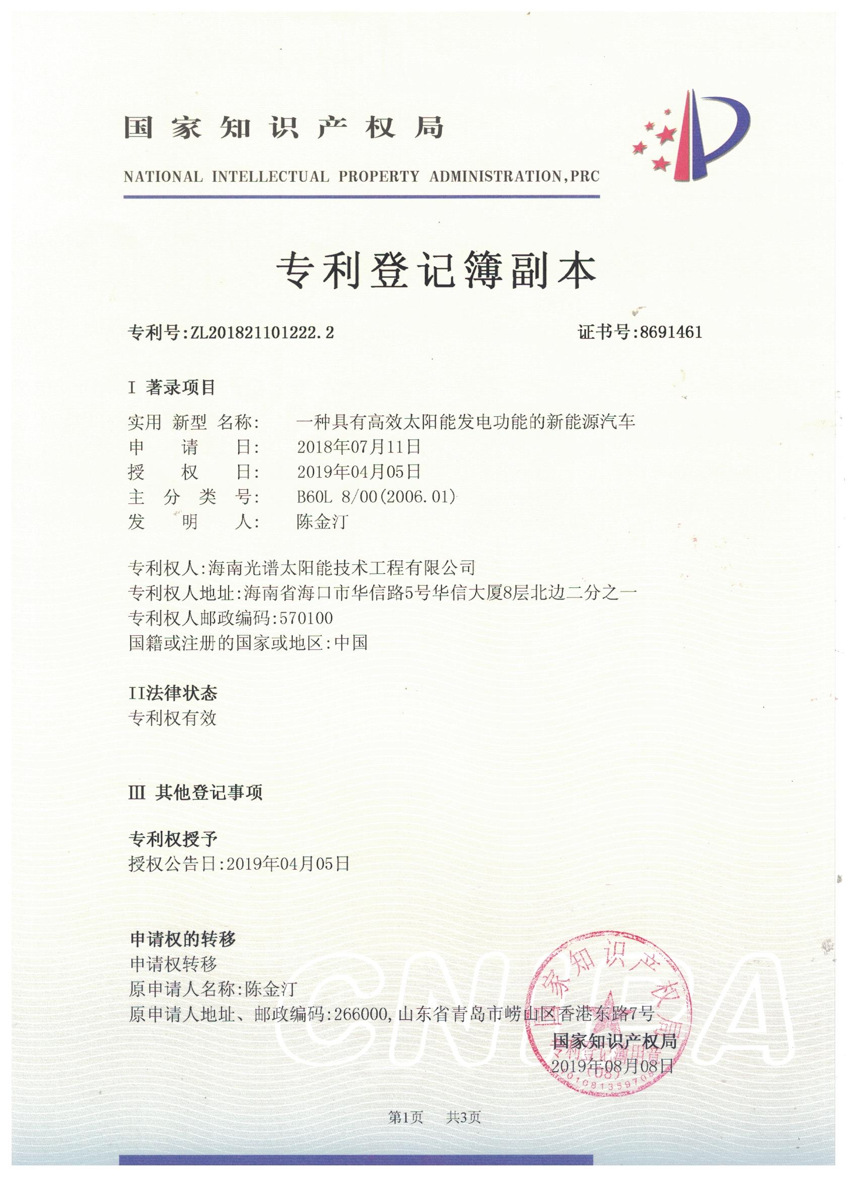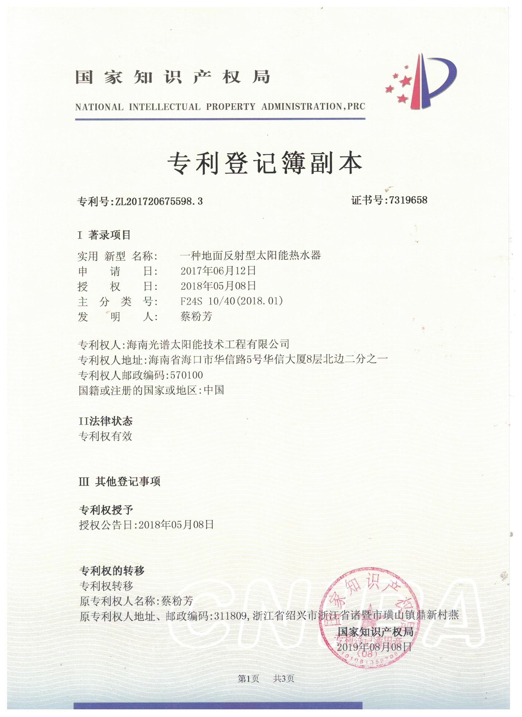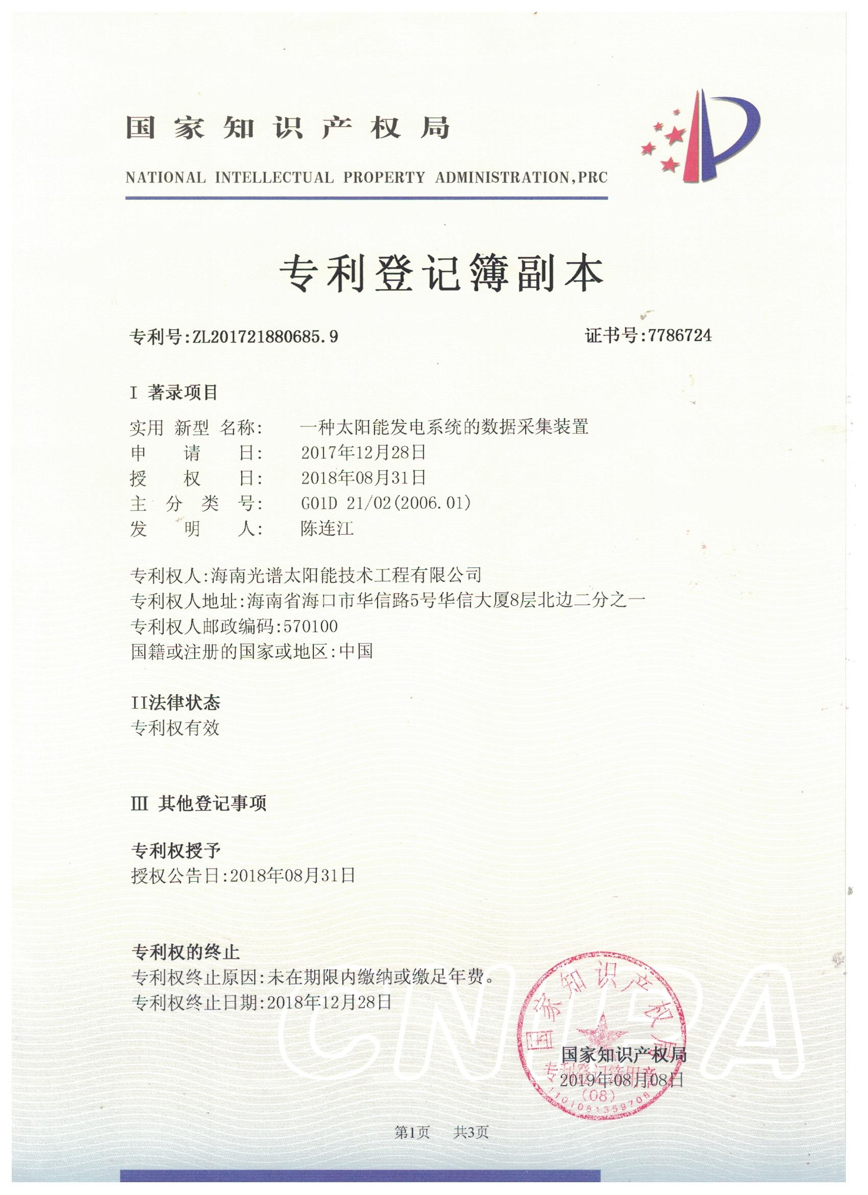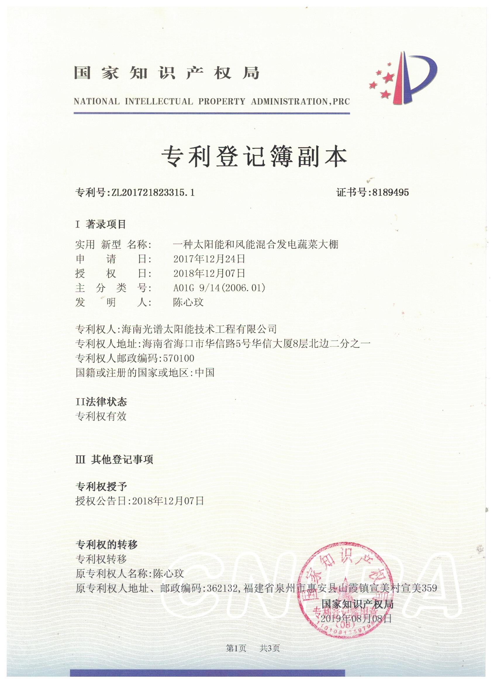 熱烈祝賀海南光譜太陽能技術工程有限公司獲得十項實用新型專利
