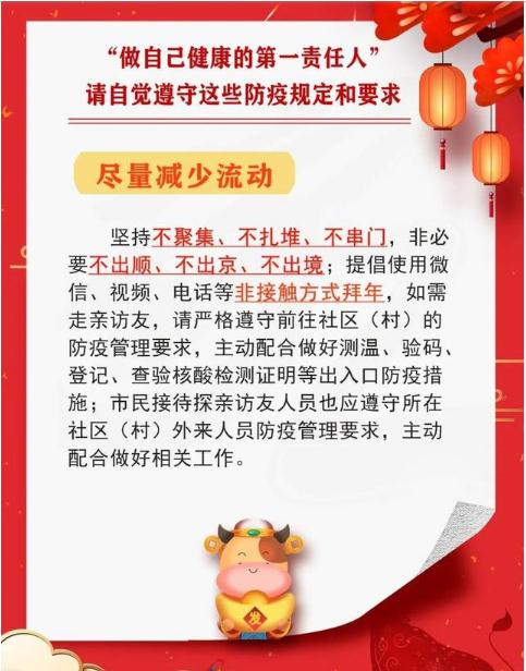 在春節假期期間,要堅持不聚集、不扎堆、不串門,非必要不出島;提倡使用視頻、電話等非接觸方式拜年,如有需求出島或前往高風險地區的人員,必須在上班前提前報備給公司及向公司進行請假,并嚴格遵守前往區域的防疫管理要求,主動配合做好測溫、驗碼、登記、查驗核酸檢測證明等出入防疫措施;如出現發熱、干咳、咳痰、咽痛、乏力、腹瀉等癥狀,請及時向所在社區及公司報告。