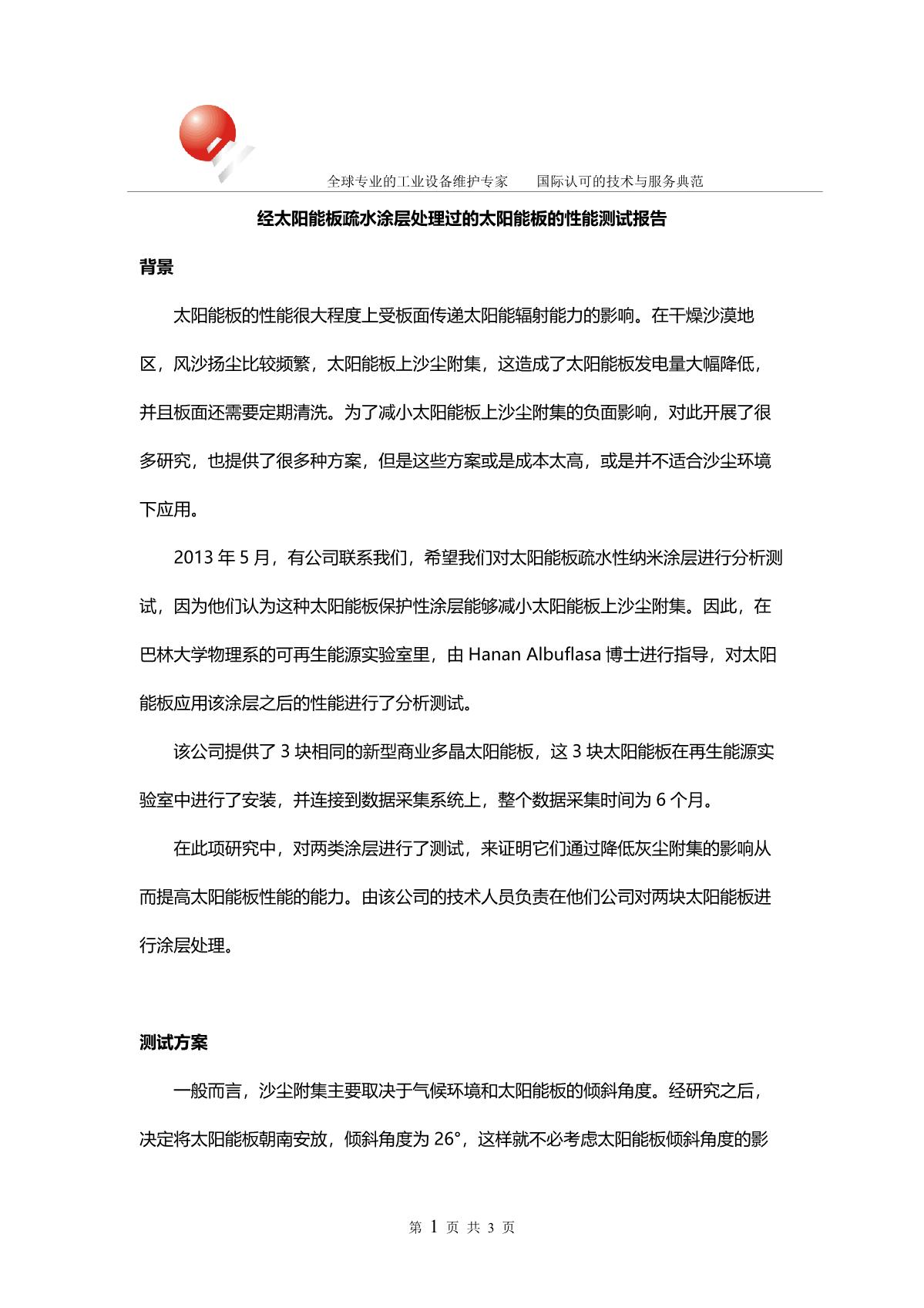 經太陽能板疏水涂層處理過的太陽能板的性能測試報告