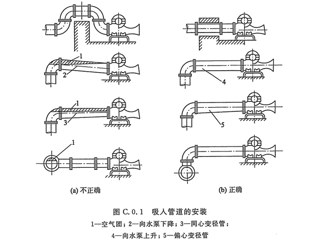 5 泵的吸入管道的安裝,應(yīng)符合圖 C.0.1所示,不得有空氣團(tuán)存在。當(dāng)泵的安裝位置高于吸入液面時,吸入管路的任何部分均不應(yīng)高于泵的入口;水平吸入管道應(yīng)向泵的吸入口方向傾斜,斜度不應(yīng)小于 5‰。
