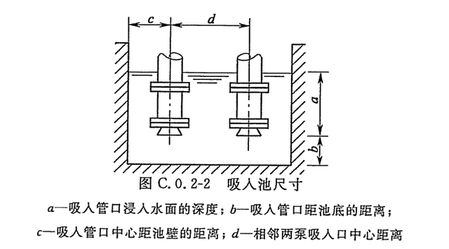3)吸入管口浸入水面下的深度不應(yīng)小于入口直徑的 1. 5 倍~2 倍,且不應(yīng)小于 500mm;吸入管口距池底的距離,不應(yīng)小于入口直徑的 1 倍~1.5 倍,且不應(yīng)小于 500mm;吸入管口中心距池壁的距離,不應(yīng)小于入口直徑的 1.25 倍~1.5 倍;相鄰兩泵吸入口中心距離,不應(yīng)小于入口直徑的2.5 倍~3 倍(圖 C.0.2-2);